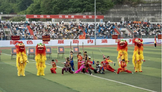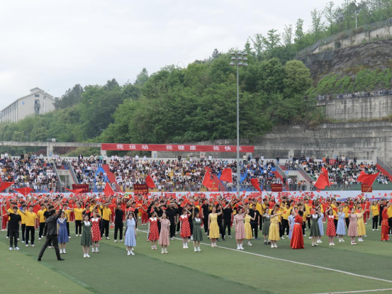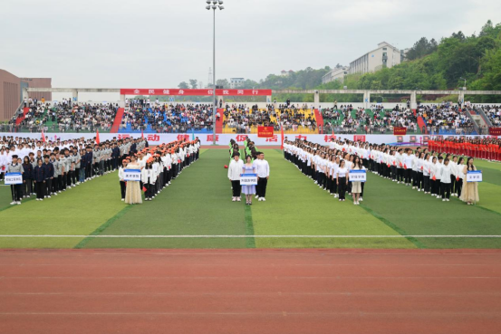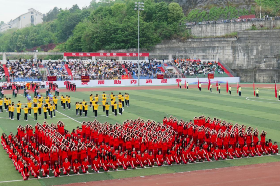 字幕方阵精神抖擞,步伐矫健,组成“我爱中国”等字样彰显浓浓爱国情,坚定三峡学子“请党放心,强国有我”的信念;竞技健美操用力与美的结合,燃动青春活力。
