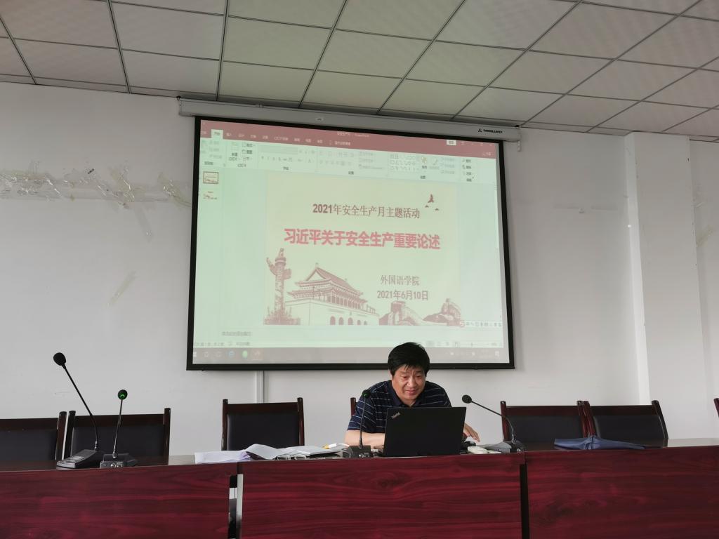 今年6月是第20个全国“安全生产月”,为了深入学习习近平总书记关于安全生产重要论述,落实安全责任,推动安全发展,外国语学院工会在明辨楼1栋604组织开展安全生产专题教育。此次会议由甘长银书记主持,全体教职工参加。